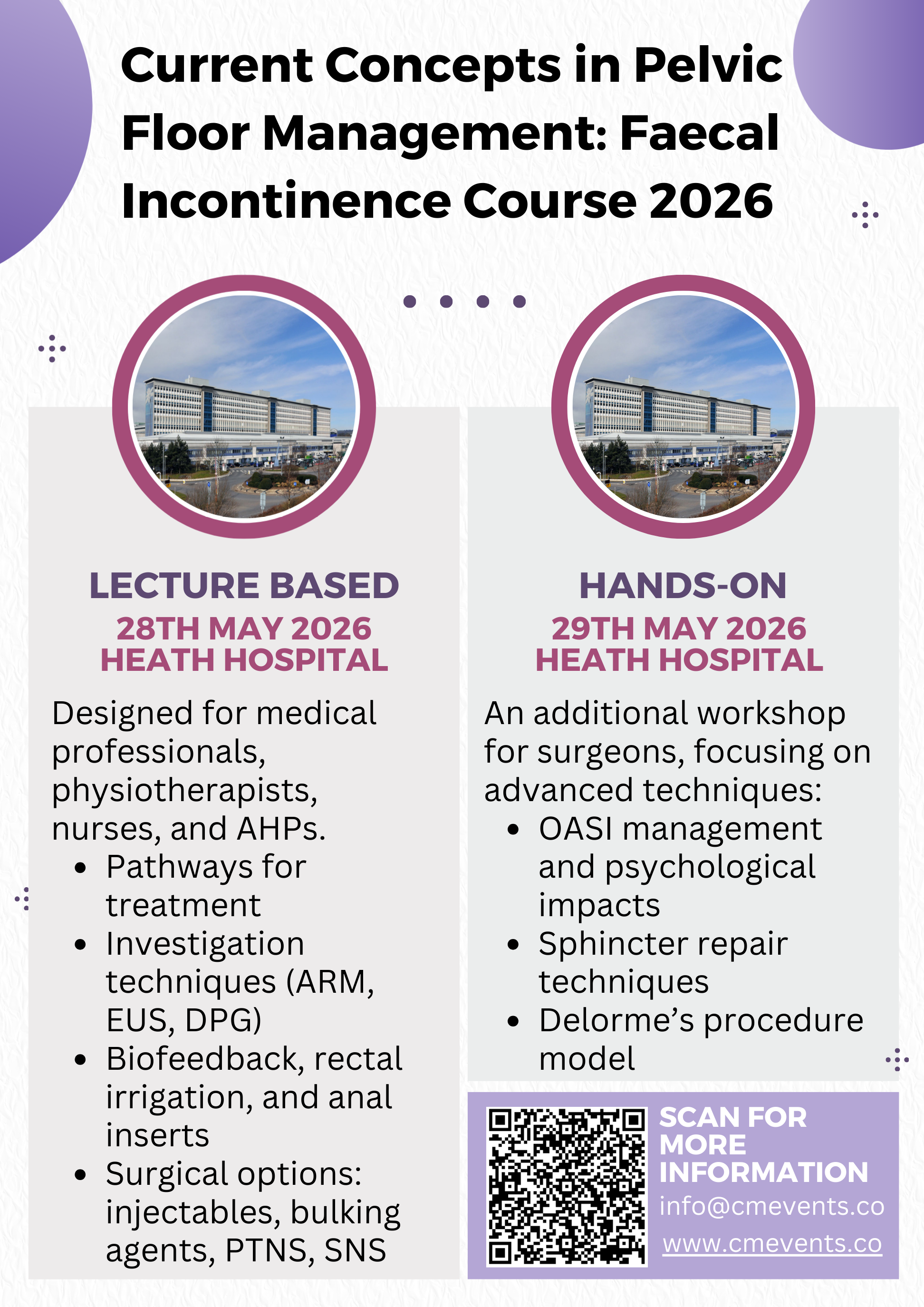 Bookings are now open for the Current Concepts in Pelvic Floor Management: Faecal Incontinence/ LARS Course 2026! We encourage you to join us on for the Lecture based session on 28th May 2026 and the Hands-on practical workshop on 29th May 2026.